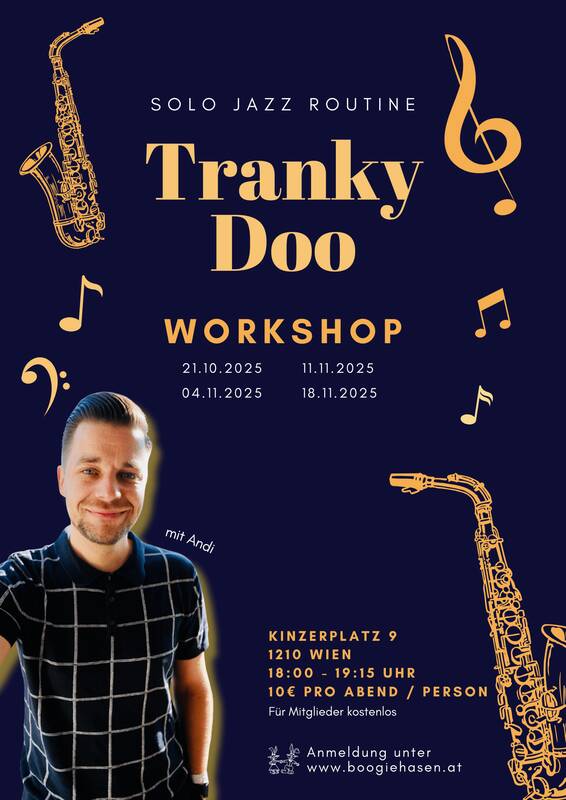 Ab dem 21. Oktober lernst du in unserem 4-wöchigen Workshop mit Andi die ikonische Choreografie dieses mitreißenden Swing-Line-Dances. Ursprünglich auf Musik wie "Tuxedo Junction" getanzt, wird der Tranky Doo heutzutage oft mit dem Song "Dipsy Doodle" performt – aber egal zur welcher Musik, die Freude am Tanzen steht im Mittelpunkt!